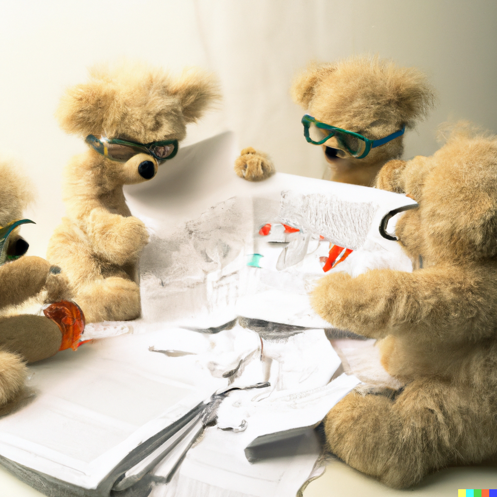 DALL·E 2022-08-07 21.29.13 – mad scientist teddybears reading scientific papers, expressionism